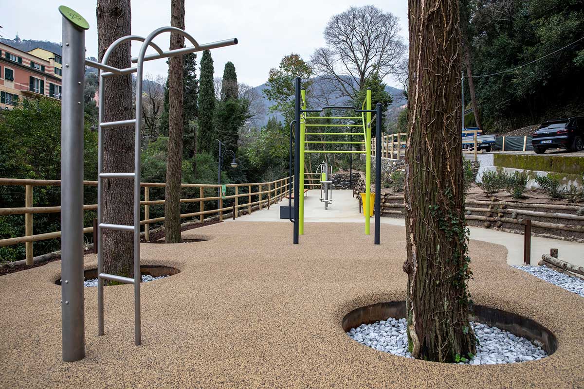 Il tutto su pavimentazione in terra naturale ed antitrauma, con 4 punti luce a led, telecamere di sorveglianza e piantine di mirto, corbezzolo, salvia, rosmarino e ginestra, all’ingresso di uno dei sentieri per il Monte di Portofino, senza vincoli orari per chi desidera fare attività sportiva.